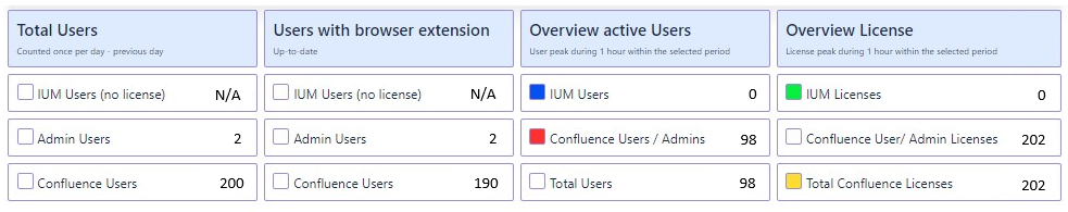 Here, for example, it can be deduced that during the two-week period, a maximum of 98 Confluence users/admins were working in Confluence simultaneously during one hour (the corresponding daily values can be seen in the diagram).