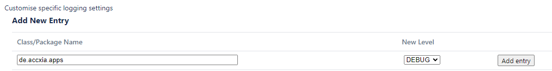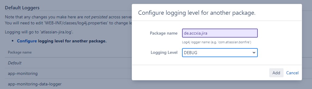 Enter de.accxia.jira under package name and select DEBUG under logging level.