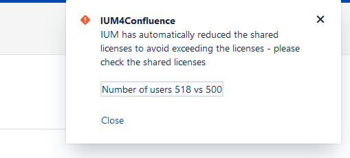 If the entire license tier is exceeded by subsequently adding new users with fixed licenses, IUM automatically reduces the shared licenses by this value and sends a popup to the administrator. (this job runs hourly)