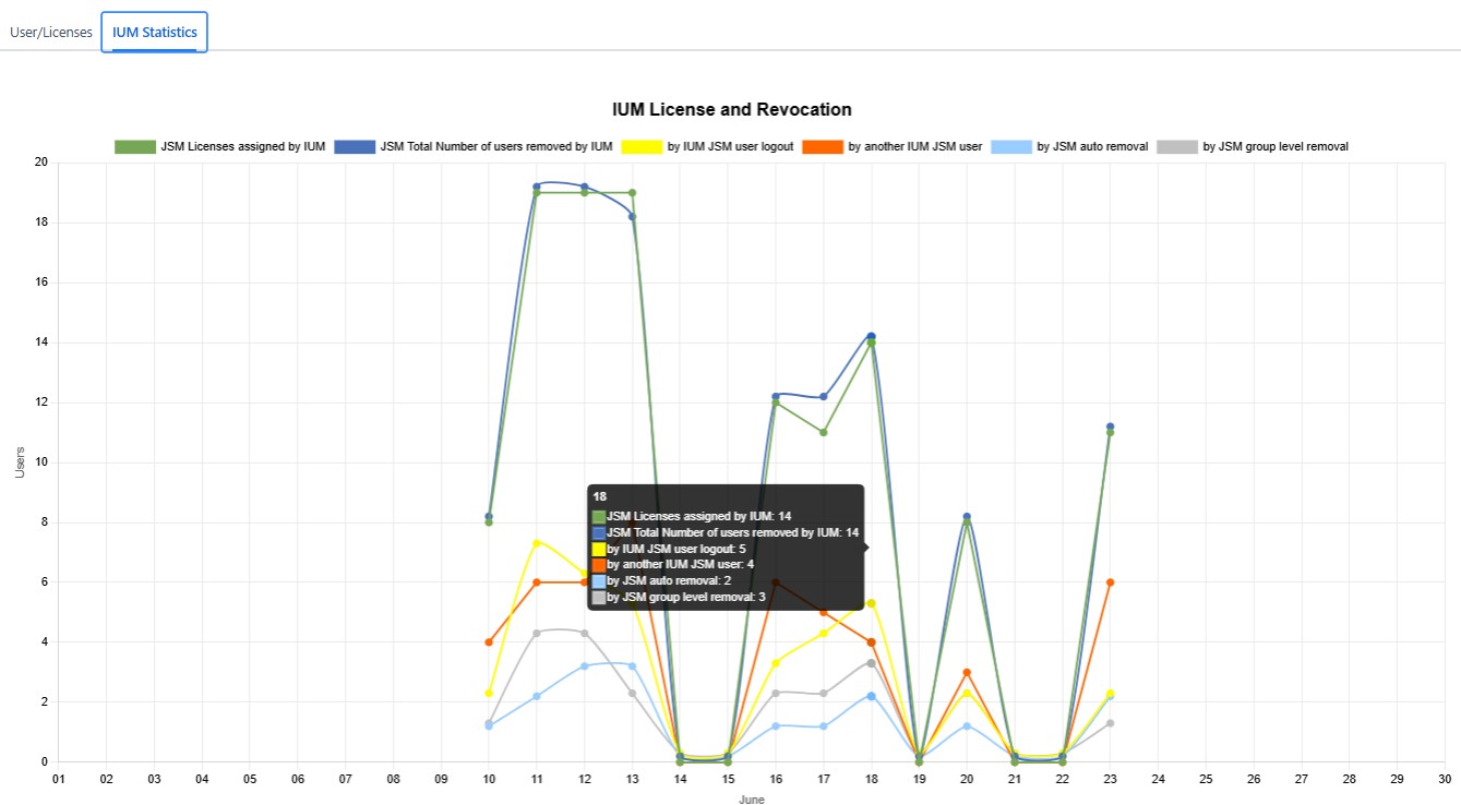 Number of assigned JSM licenses per day. Individual JSM IUM users can be counted multiple times within a day.Total Number of JSM users removed by IUM