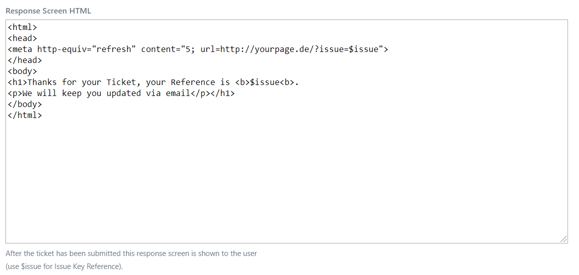 Response Screen HTML - Enter any valid HTML. You can define your own styled response. Keep empty to use default response screen. You even can add any javascript, csss or simply redirect to any URL.