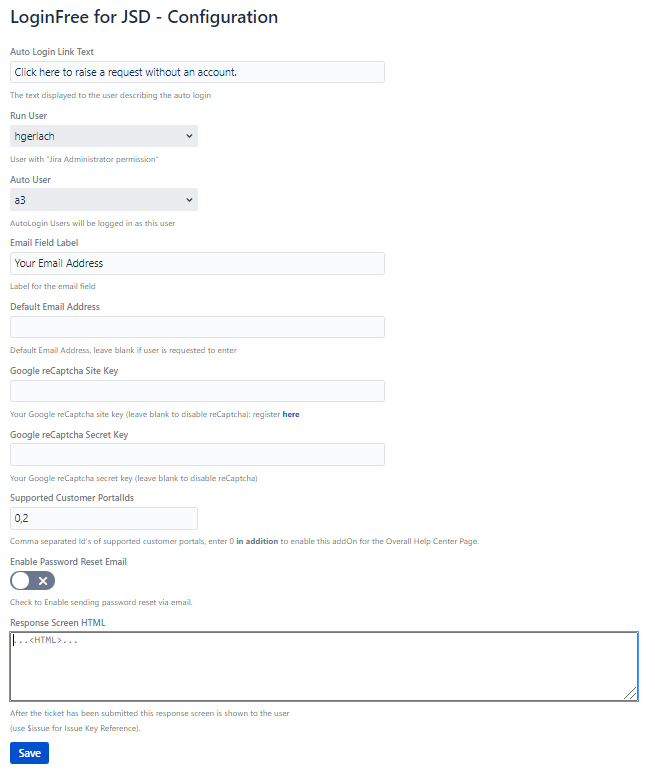 Auto User - This is the user account which is initially used for all anonymous users. Make sure it does not have any application access to Jira Software, Jira Core or Jira Service Desk. This is verified while saving the form.