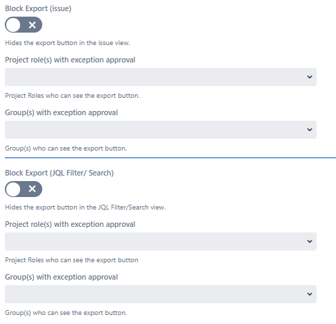Hides the export button on the issue view. (Without worklog viewer or estimates permission, exports are prevented even when turned off.)